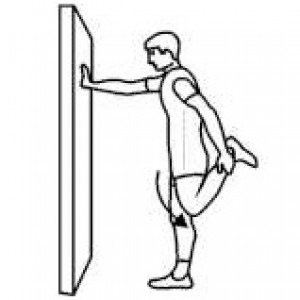 3) Étirement des quadriceps : En position debout, pliez un des genoux et maintenez-le en place avec votre main pendant quelques secondes. Au besoin, servez-vous de la main libre pour prendre appui contre un mur. |